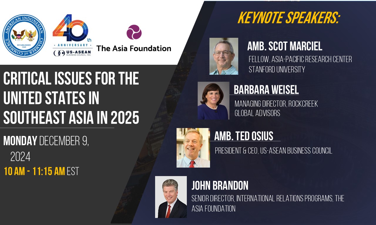 AICC is pleased to host an online session in collaboration with USABC and the Asia Foundation on December 9 to examine the “Critical Issues for the United States in Southeast Asia in 2025” which is the title of a recent report released by The Asia Foundation. It is based on an eight-month series of discussions that ranged from economic relations, climate change policy, energy, and maritime security to how to support ASEAN and promote democracy, human rights, and good governance in the region. The 12 members of the Task Force that prepared this report are scholars, analysts, and practitioners who work for think tanks, nongovernmental organizations, business associations, and the private sector.